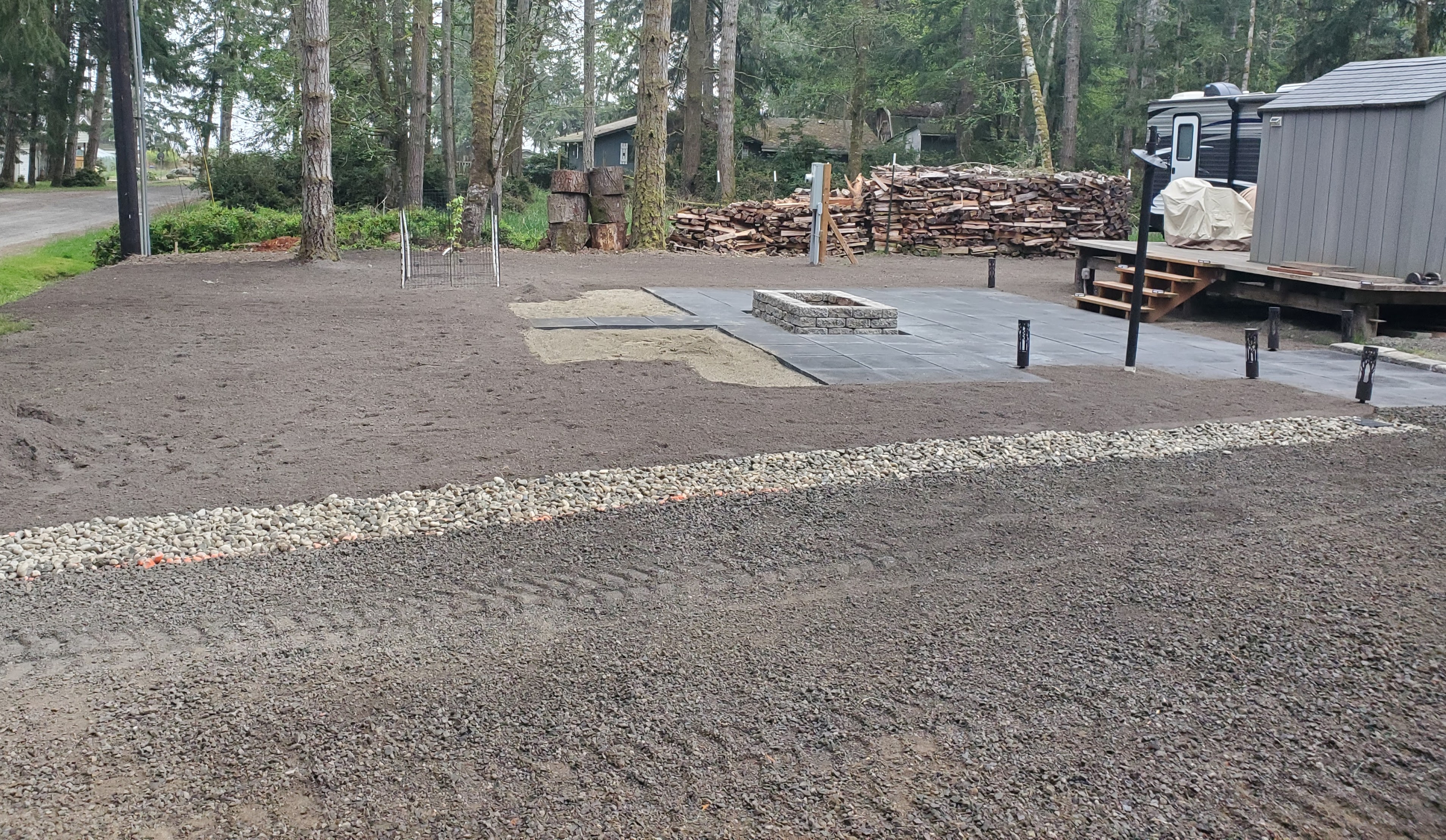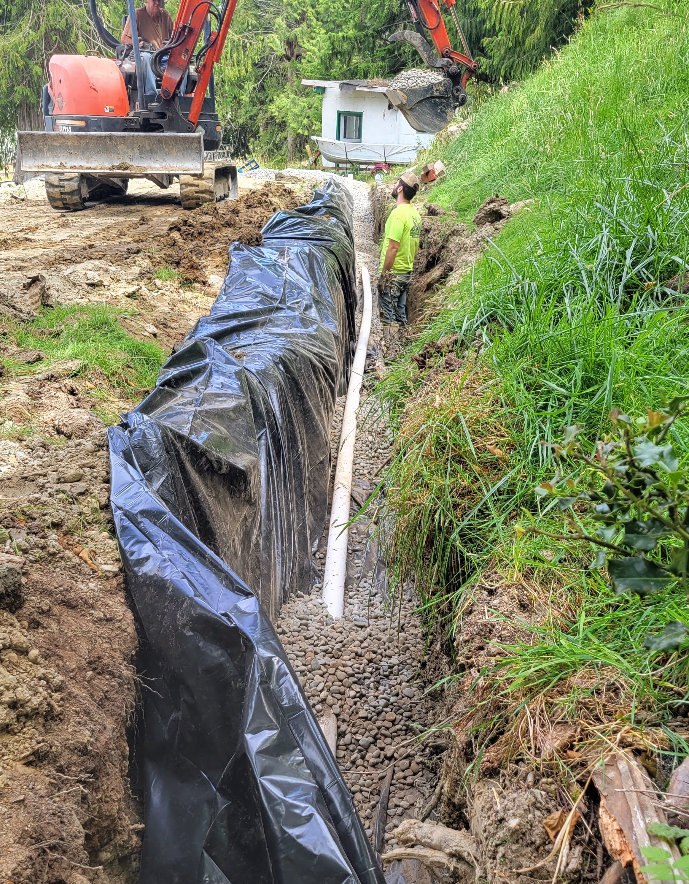 Access roads: With your stamped site plan in hand, we can create a access road by removing trees and stumps, compacting soils as necessary, installing road fabric and spreading a crushed rock driving surface to let the site development process continue.